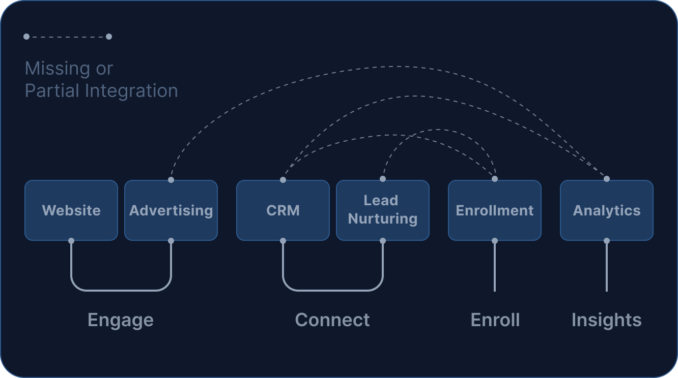 SchoolMint had built or acquired a broad suite of products covering every stage of the enrollment funnel, from digital advertising and lead nurturing to enrollment and analytics (Engage, Connect, Enroll, Insights). But despite this breadth, the products were siloed, and schools were struggling to connect the dots. Low usage, high churn, and declining revenue all traced back to the same structural problem: A disconnected funnel.