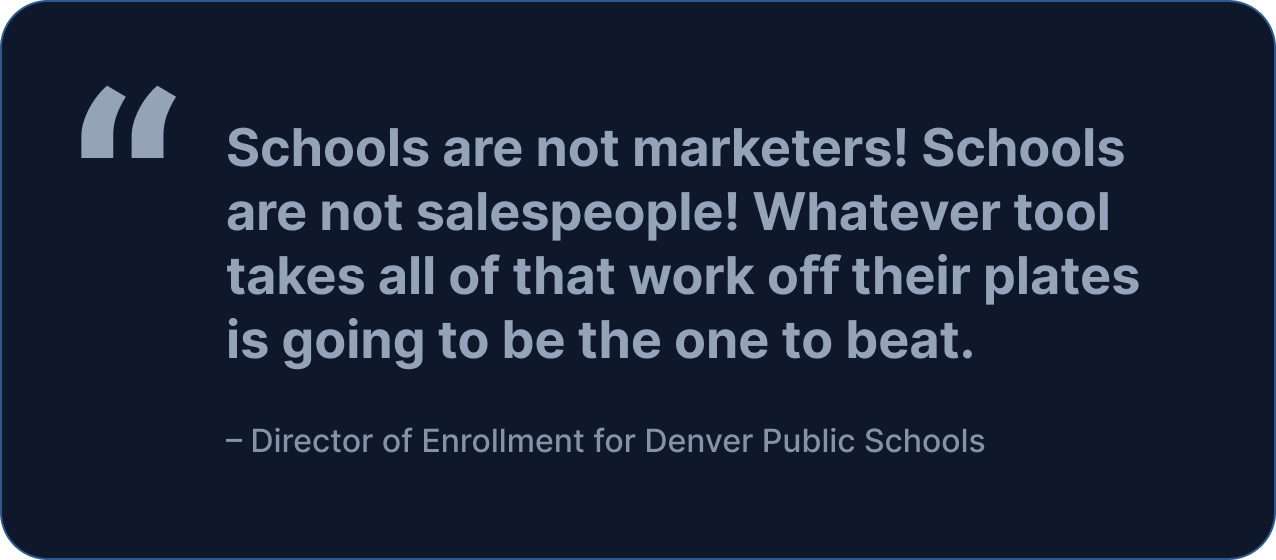 Qualitative research, including interviews with current customers, win/loss analysis, and customer support ticket review, painted a consistent picture of our primary user. School administrators and enrollment coordinators are not marketing professionals. They are generalists managing a wide range of operational responsibilities, and recruitment is one item on a long list.